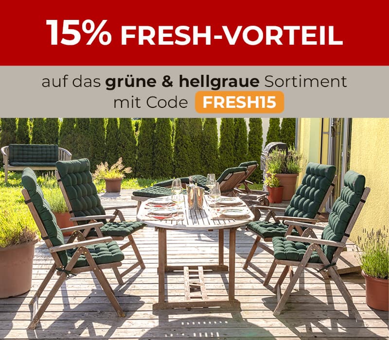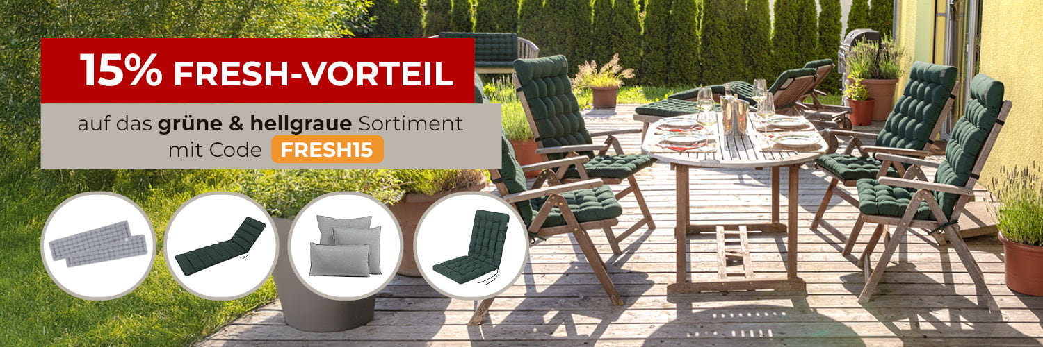 Alle hellgrauen und grünen Sitzkissen, Auflagen und Gartenpolster von HAVE A SEAT Living jetzt mit 15 Prozent Rabatt.