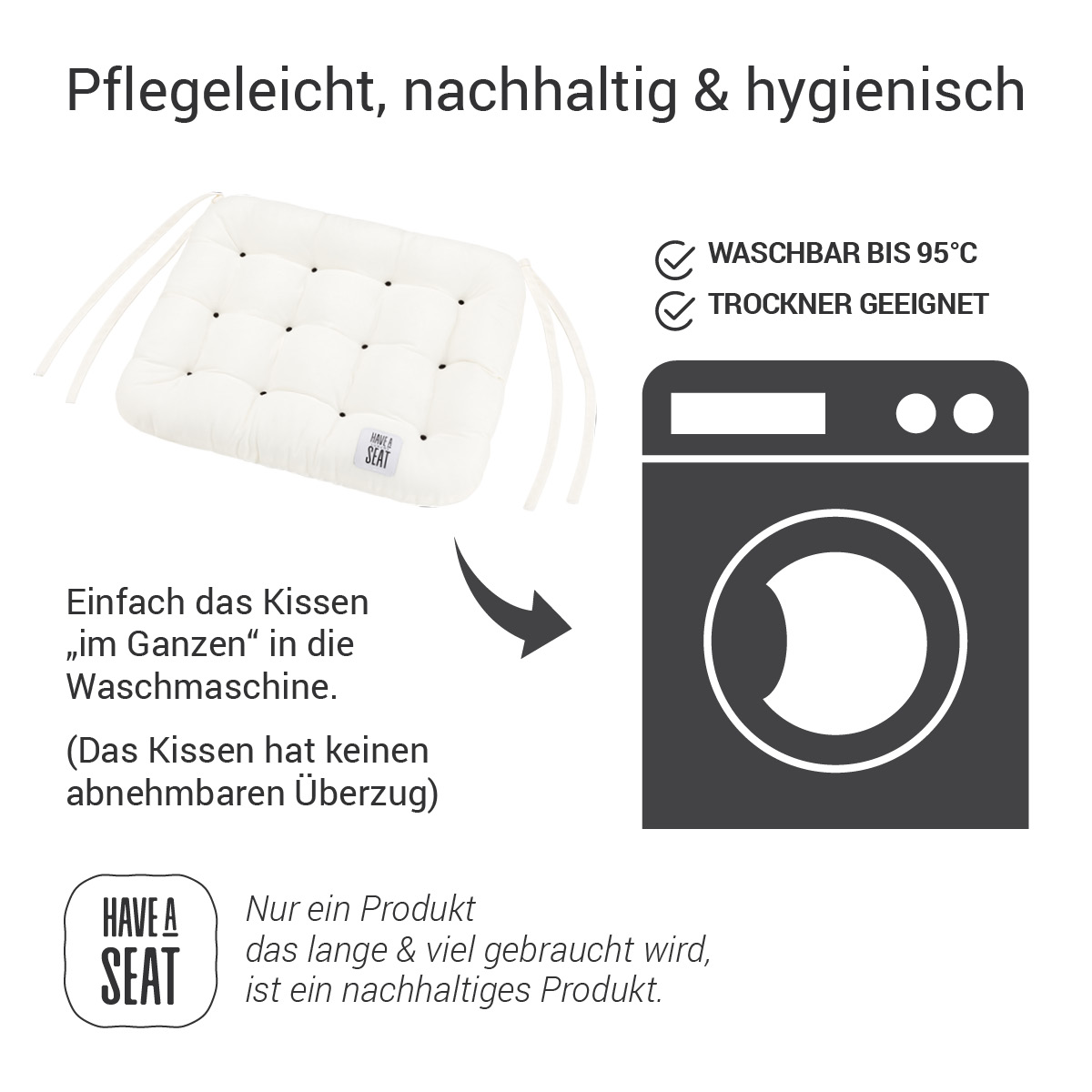 - Alle HAVE A SEAT Gartenstuhlauflagen sind in einer normalen Waschmaschine im Ganzen waschbar.