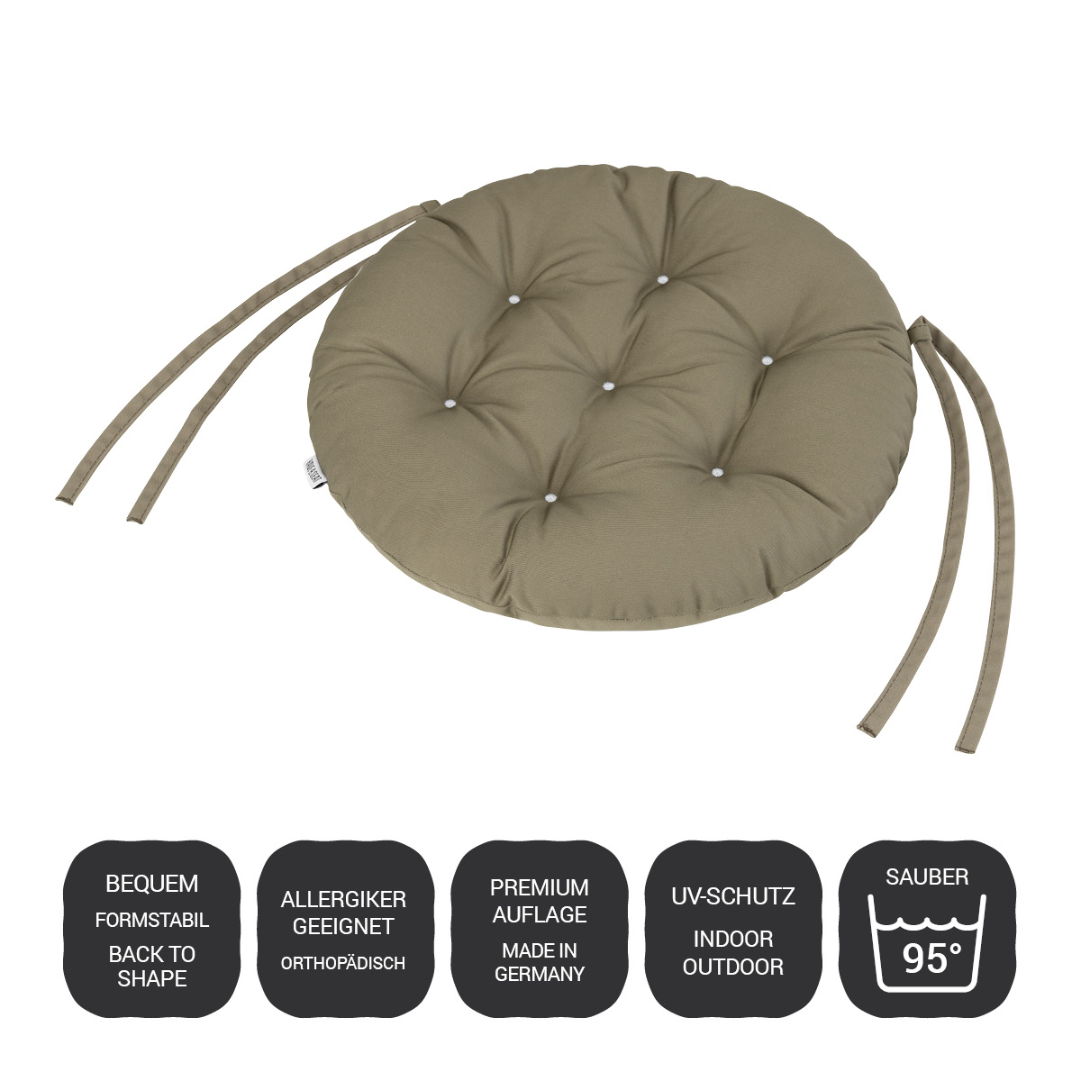 Das Geheimnis für das einzigartige Sitz- und Relaxerlebnis unserer Sitzkissen rund liegt in unserem speziell konzipiertem Füllmaterial. Dieses wurde mit Orthopäden und Textiltechnikern entwickelt und optimiert, um einen größtmöglichen Wohlfühlfaktor zu erreichen. Durch unsere zusätzliche Back-to-Shape Veredelung bleibt diese Eigenschaft auch nach jeder Wäsche und über viele Jahre erhalten.