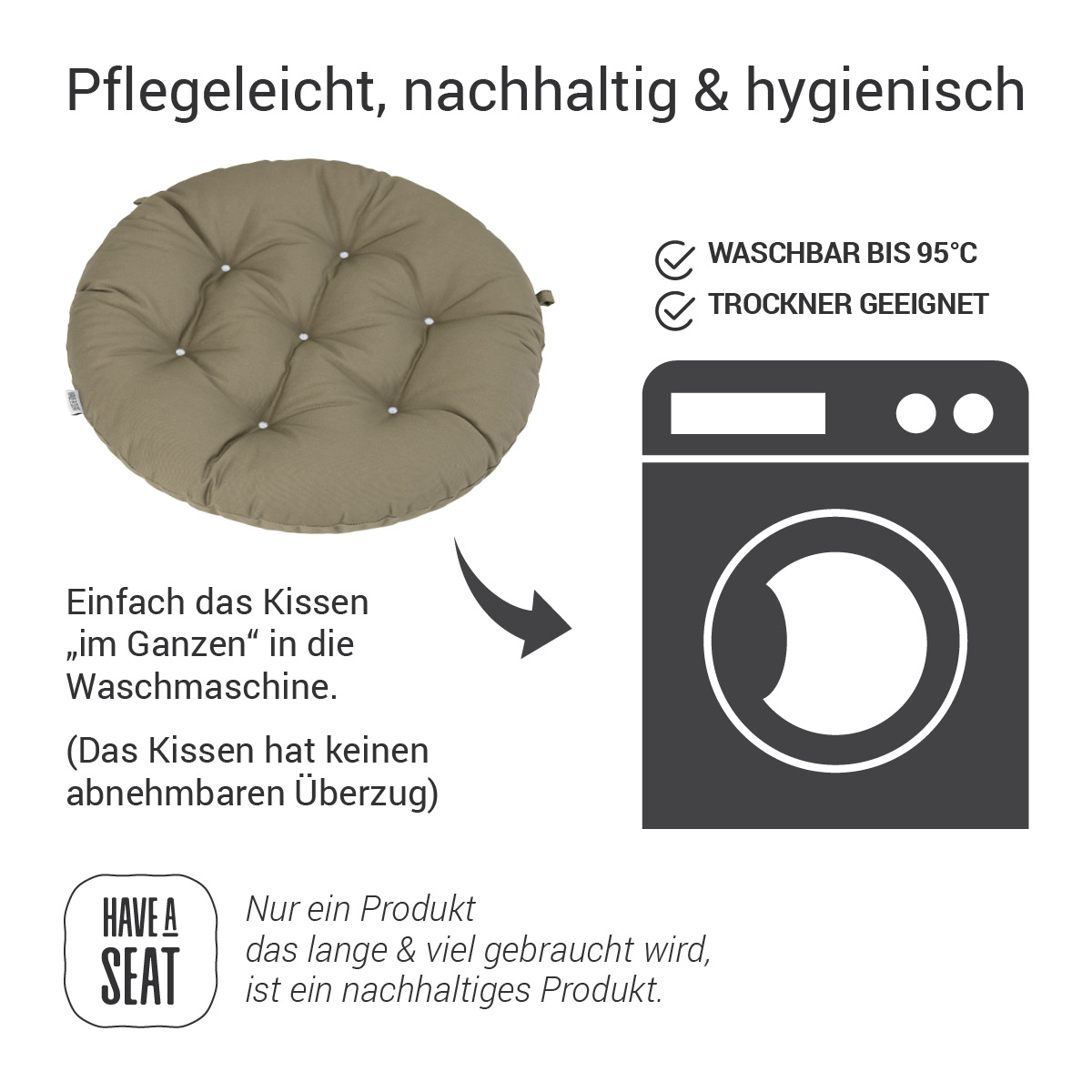 - Alle HAVE A SEAT Stuhlkissen sind in einer normalen Waschmaschine im Ganzen waschbar.